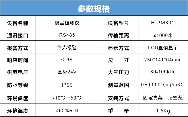 处理模块:将检测单元输出的电信号转化为粉尘浓度值(如 mg/m³),并进行数据存储、统计;