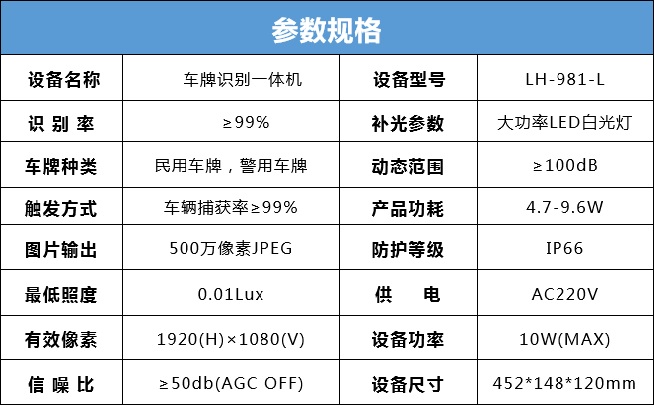 车牌识别 | 识别率 | ≥99%,后五位识别率≥99% | |
